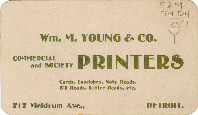 Favorite this☆ Business card for Wm. M. Young & Co. Description: View of a business card for Wm. M. Young & Co. Printed on front: "Wm. M. Young & Co. Commercial and society printers. Cards, envelopes, note heads, bill heads, letter heads, etc. 717 Meldrum Ave., Detroit." Details Resource ID: bh017808 Subject: Printing industry--Michigan--Detroit Printers--Michigan--Detroit Business cards Date Issued: Unknown year Format: 1 business card ; 2.75 x 4.5 in. Member of: Burton Historical Collection Filing Location: E&M 977.4D4 381 Y Rights: Physical rights are retained by DPL. Copyright is retained in accordance with U.S. copyright laws.
