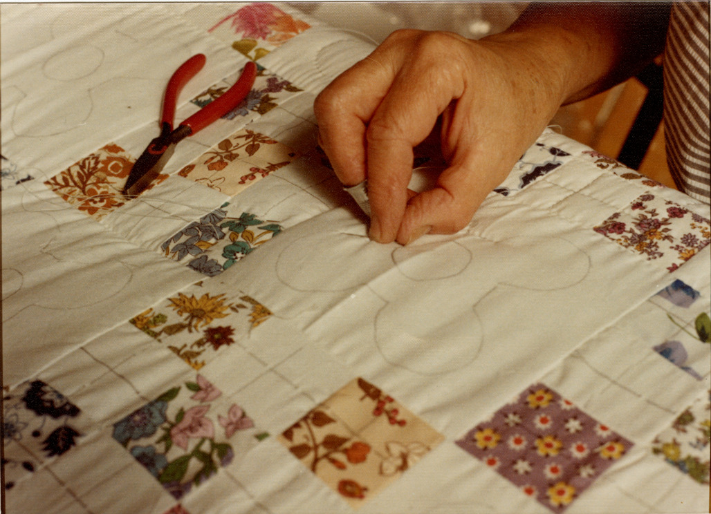 Close-up view of a woman quilting at the Summer Festival Arts & Crafts Show. Label on back: "Michigan Thumb area--Small towns--Quilters series, 3 of 3, 1970's." Handwritten on back: "Arts & Crafts Show, Summer Festival, 1973."