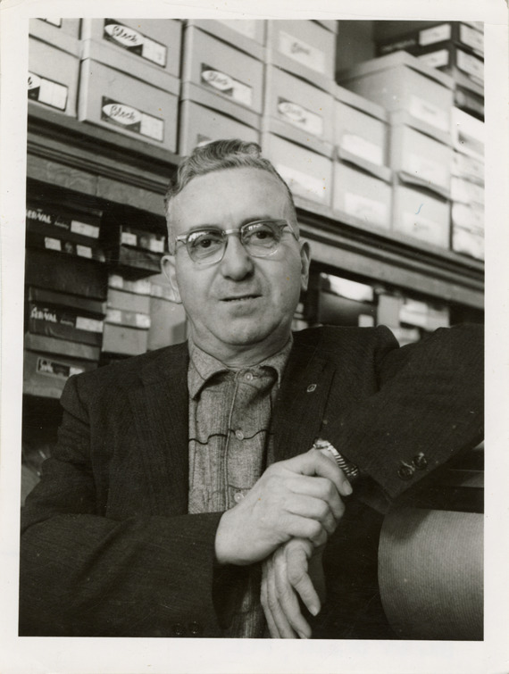 View of George Scott, at George Scott Men and Boys Wear, Wallpaper and Paint, Harbor Beach, Michigan. Label on back: "Michigan Thumb area--Small towns--George Scott Men and Boys Wear, Wallpaper and Paint." Handwritten on back: "George Scott Men and Boys Wear, Wallpaper and Paint, Harbor Beach, MI."
