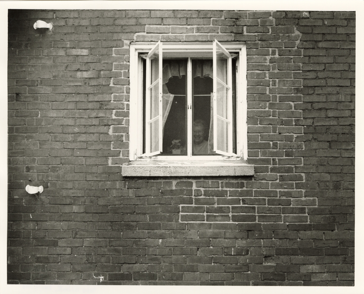 View of Velma Donahue in kitchen window, Donahue farm, Port Hope, Michigan. Label on back: "Michigan Thumb area--Farms--Velma Donahue in kitchen window close up, 1970's." Handwritten on back: "Port Hope, MI. Velma Donahue, kitchen window, 7160 Filion Rd."