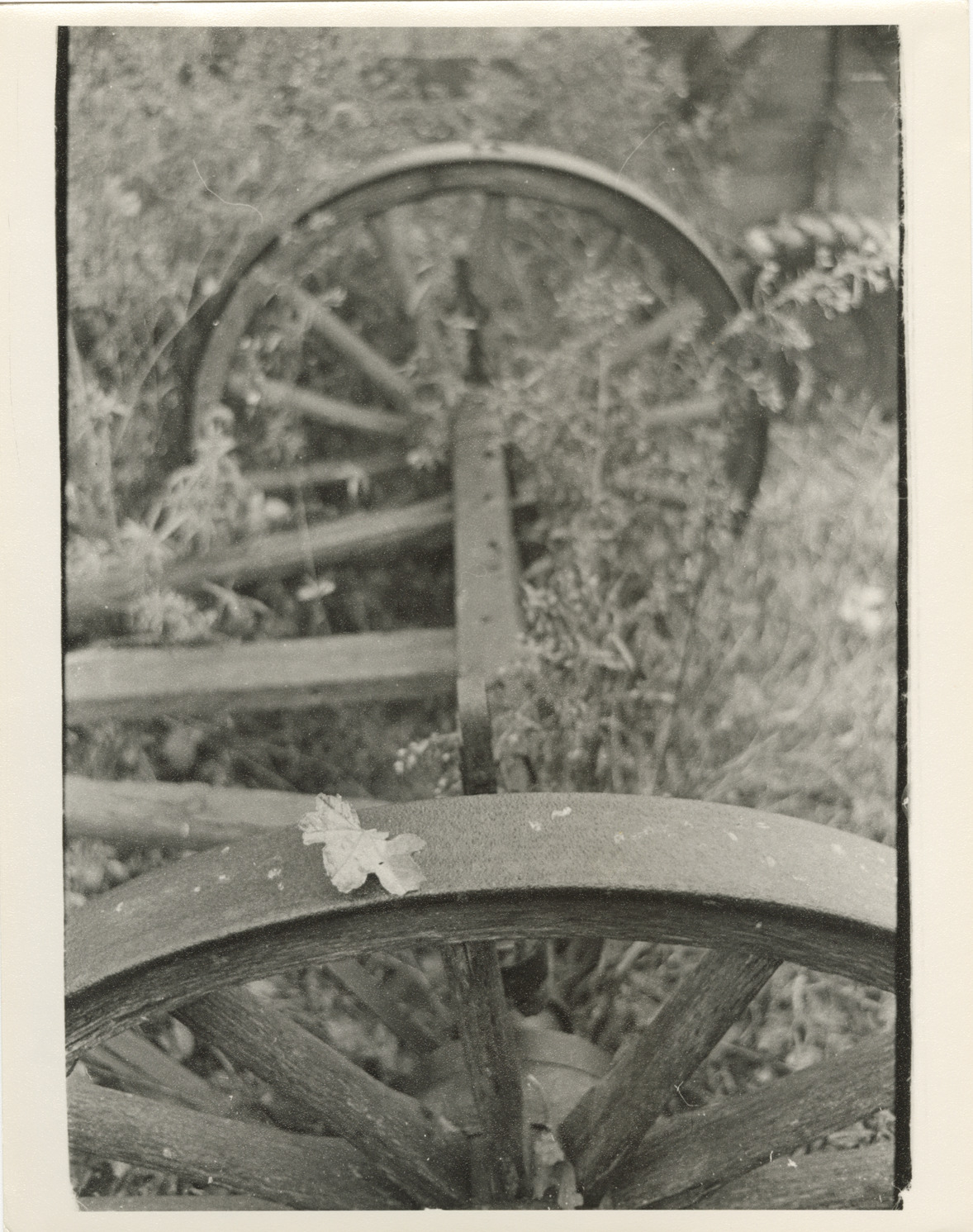 View of wagon wheels and axle. Label on back: "Michigan Thumb area--Past its prime--Wheel and axle (vertical)."