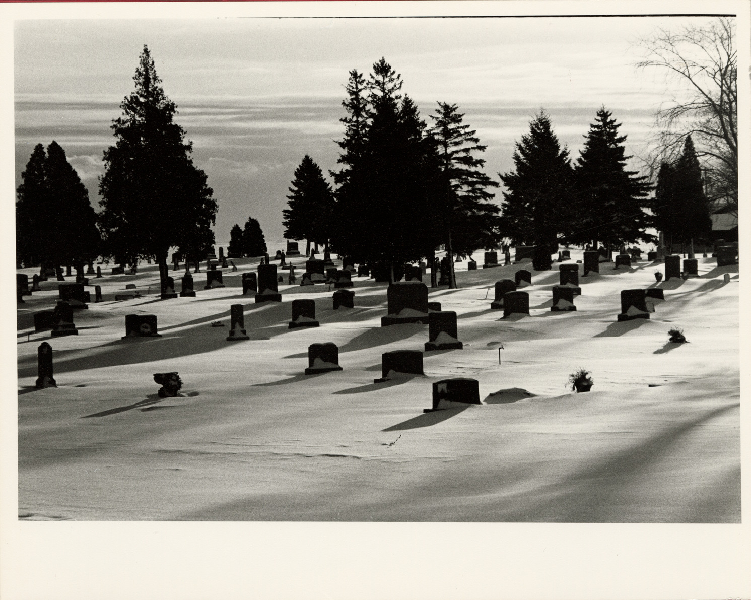 Favorite this☆ Cemetery during winter Description: View of snow-covered ground and headstones in cemetery during winter. Label on back: "Michigan Thumb area--Small towns--Michigan cemetery in the snow." Details Resource ID: bh017949 Creator: Donahue, Steven W. Subject: Cemeteries--Michigan--Thumb District Gravestones--Michigan--Thumb District Photographers--Michigan Photographic prints Date Issued: Unknown year Format: 1 photographic print mounted on mat board ; 8 x 10 in. Member of: Burton Historical Collection Steven W. Donahue Collection Filing Location: MS/Donahue, Steven W., Box 1 Rights: Physical rights are retained by DPL. Copyright is retained in accordance with U.S. copyright laws. Copyright transferred to Detroit Public Library, 2017-09-12.