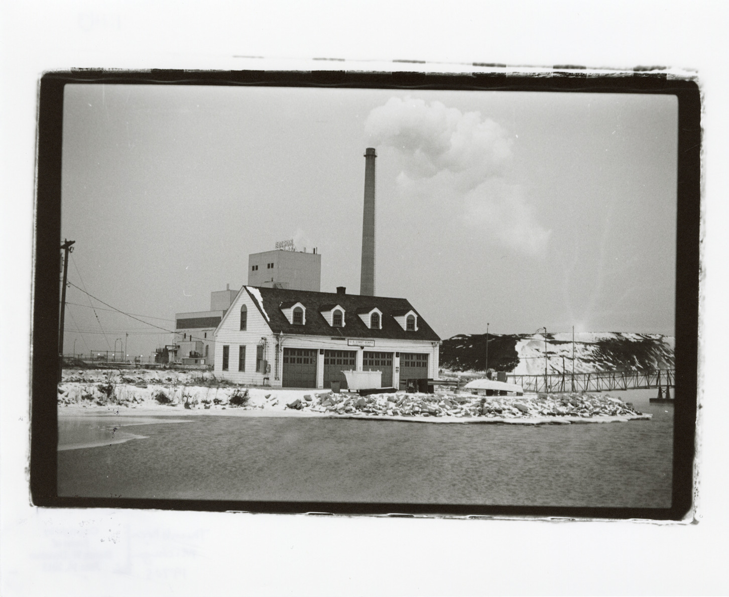 View of the U.S. Coast Guard building and Detroit Edison power plant in Harbor Beach, Michigan. Smokestack in background. Label on back: "Michigan Thumb area--Small towns--Coast Guard building and Edison plant, Harbor Beach, MI." Handwritten on back: "Thumb area, Michigan, 1970s."