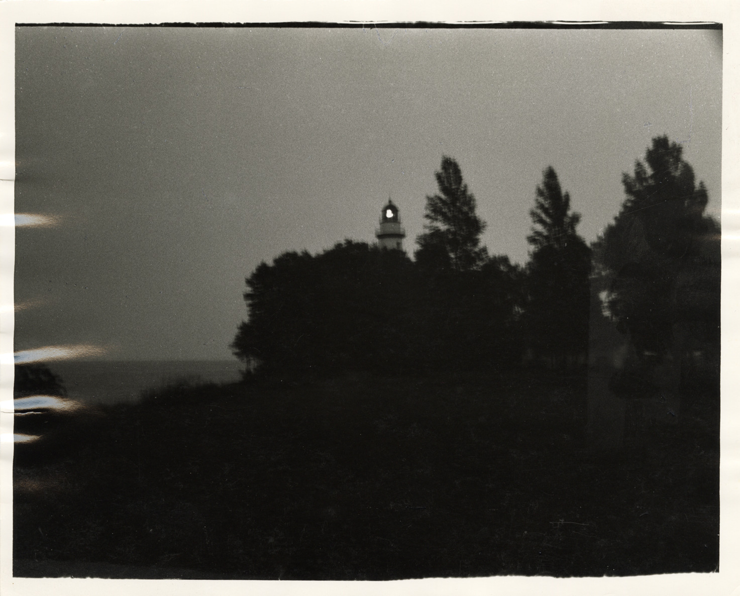 View of a lighthouse at night. Label on back: "Michigan Thumb area--Water--Lighthouse at night." Handwritten on back: "Thumb area, Michigan, 1970s."