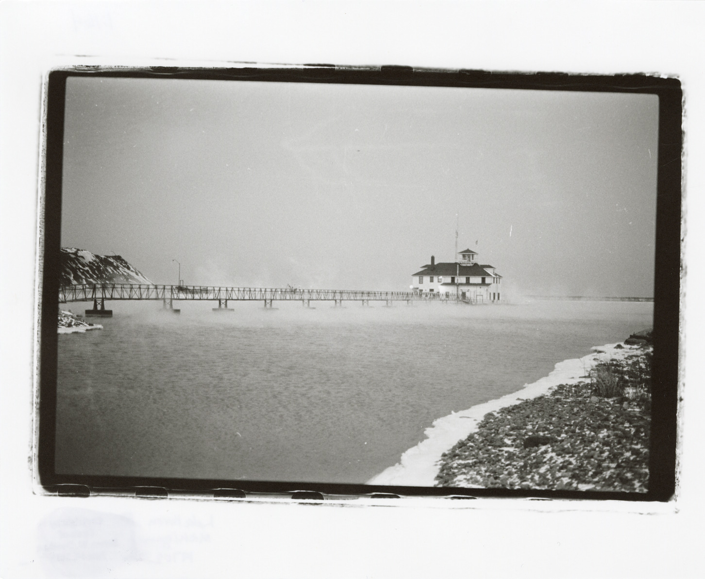 View of the U.S. Coast Guard building and bridge on Lake Huron. Label on back: "Michigan Thumb area--Water--Coast Guard building and bridge." Handwritten on back: "Lake Huron, Michigan, 1970s."