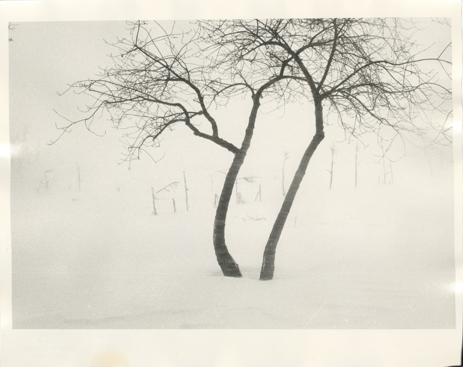 View of bare trees in snow. Label on back: "Michigan Thumb area--Winter--Two curved trees in snow." Handwritten on back: "Michigan, 1970s."