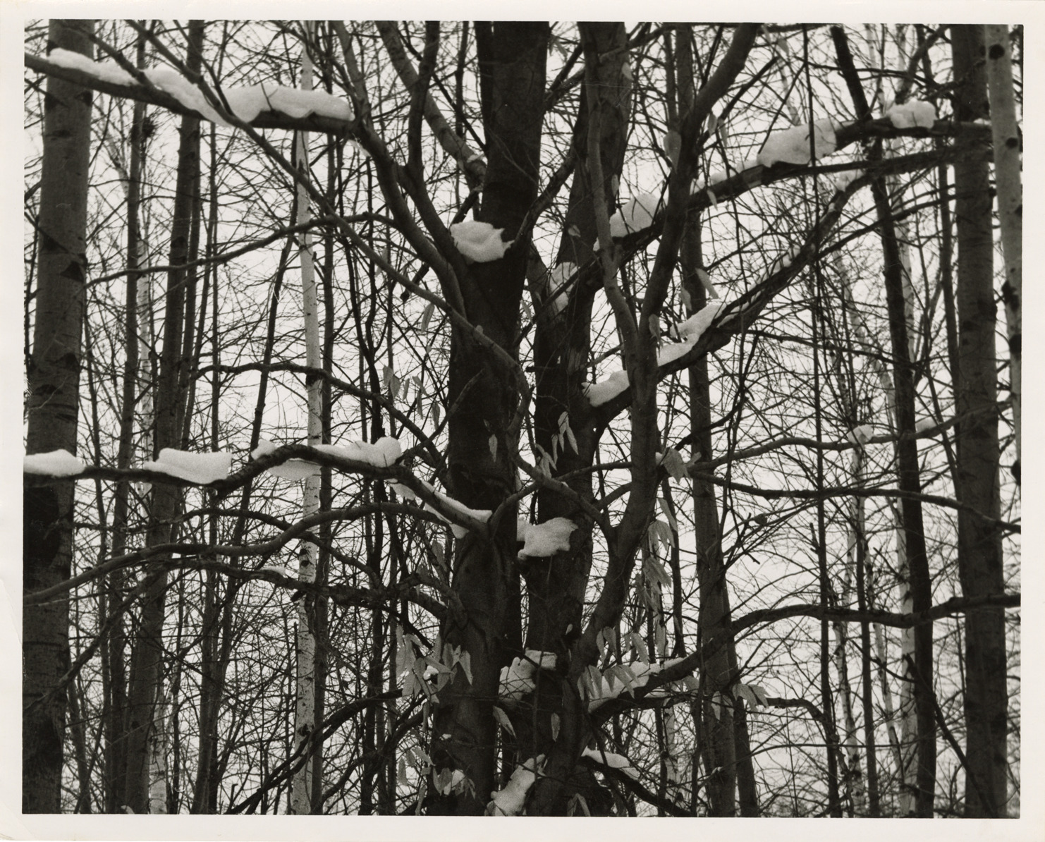 View of snow on tree branches during winter. Label on back: "Michigan Thumb area--Winter--Tree limbs in snow."