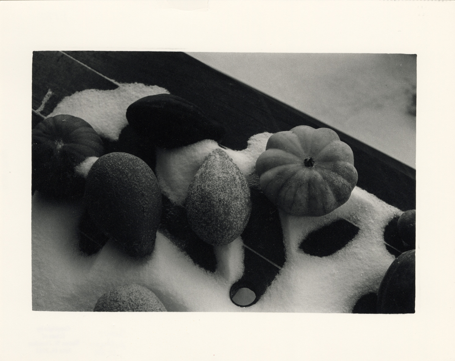 Favorite this☆ Squashes on snow-covered bench Description: View of squashes on snow-covered bench during winter. Label on back: "Michigan Thumb area--Winter--Squashes in snow." Handwritten on back: "Snow, Michigan, 1970s." Details Resource ID: bh017980 Creator: Donahue, Steven W. Subject: Squashes--Michigan--Thumb District Snow--Michigan--Thumb District Winter--Michigan--Thumb District Photographers--Michigan Photographic prints Date Issued: Unknown year in the decade of the 1970s Format: 1 photographic print ; 8 x 10 in. Member of: Burton Historical Collection Steven W. Donahue Collection Filing Location: MS/Donahue, Steven W., Box 1 Rights: Physical rights are retained by DPL. Copyright is retained in accordance with U.S. copyright laws. Copyright transferred to Detroit Public Library, 2017-09-12.