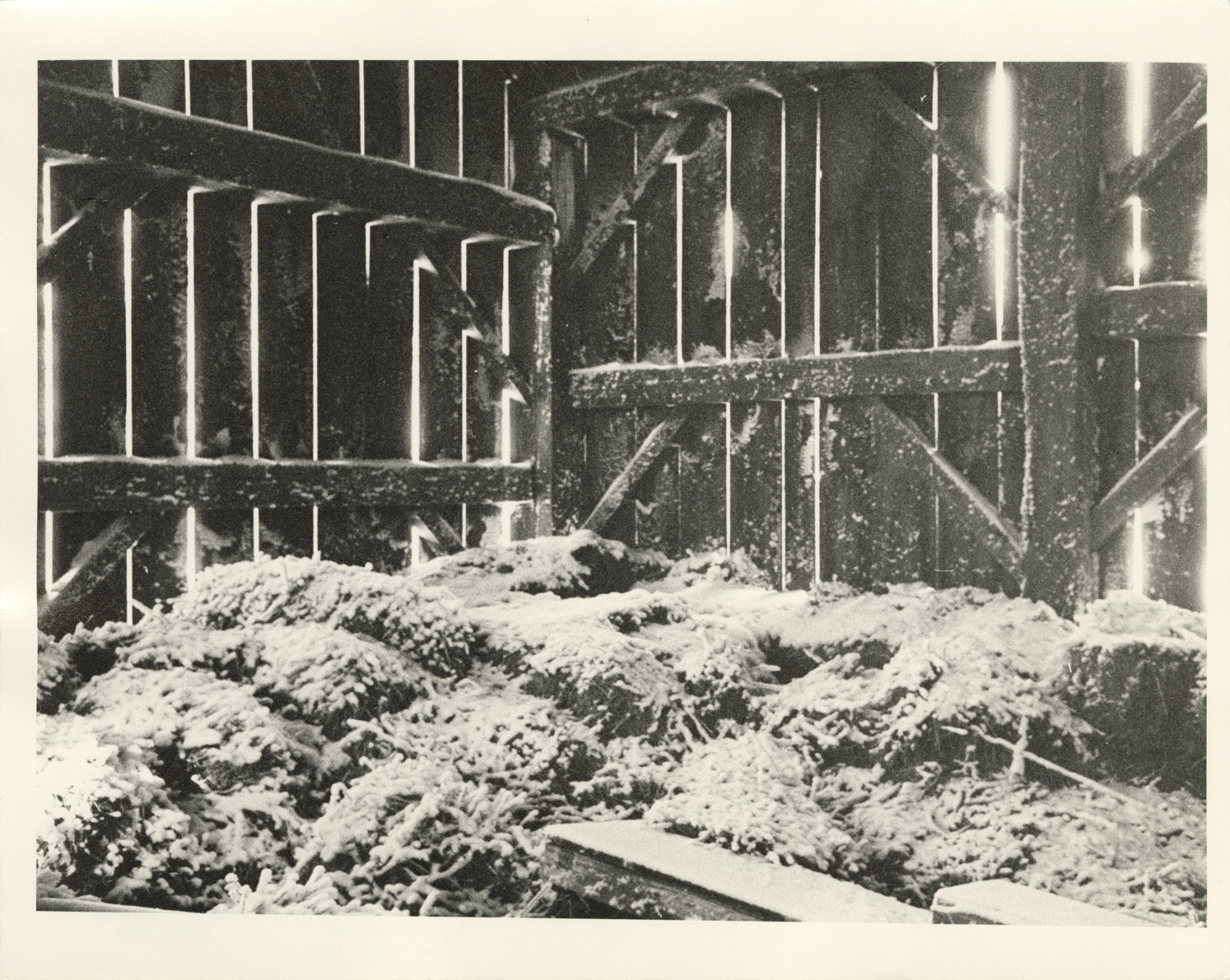 View of snow inside barn during winter. Label on back: "Michigan Thumb area--Winter--Snow in barn." Handwritten on back: "Michigan barn in snow, Michigan, 1970s."