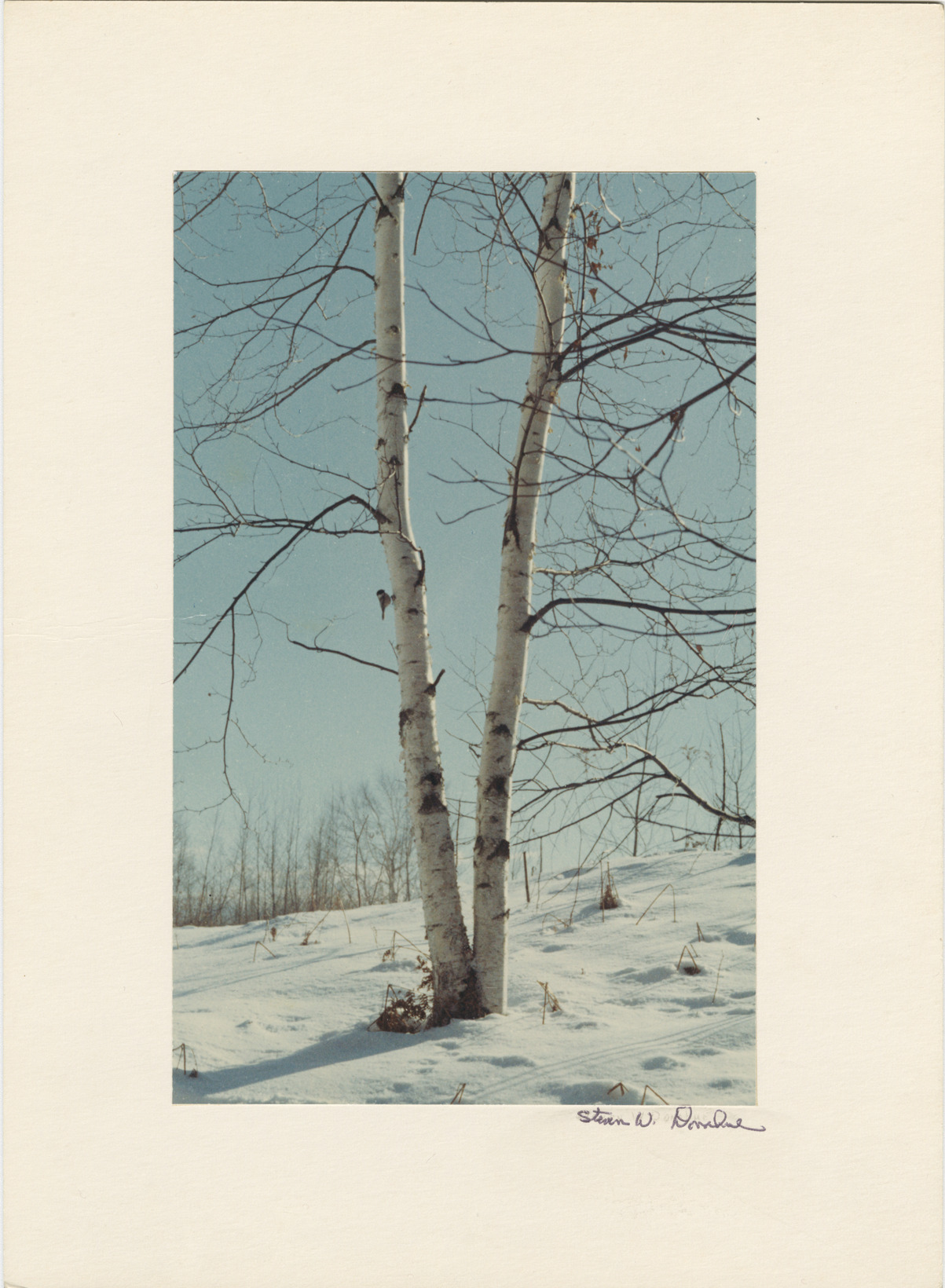 Favorite this☆ Birch tree in winter Description: View of birch tree in snow-covered field during winter. Handwritten on front: "Steven W. Donahue." Label on back: "Michigan Thumb area--Winter--Double trunked birch in snow." Details Resource ID: bh017986 Creator: Donahue, Steven W. Subject: Birch--Michigan--Thumb District Snow--Michigan--Thumb District Winter--Michigan--Thumb District Photographers--Michigan Photographic prints Date Issued: Unknown year Format: 1 photographic print mounted on mat board : col. ; image 8 x 5 in. Member of: Burton Historical Collection Steven W. Donahue Collection Filing Location: MS/Donahue, Steven W., Box 1 Rights: Physical rights are retained by DPL. Copyright is retained in accordance with U.S. copyright laws. Copyright transferred to Detroit Public Library, 2017-09-12.