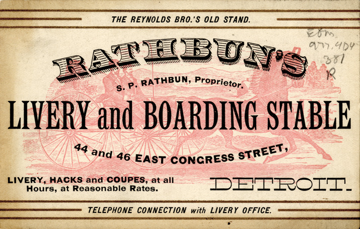 View of an advertising card for Rathbun's livery and boarding stable, depicting two men in a horse-drawn carriage. Printed on front: "Rathbun's livery and boarding stable. S.P. Rathbun, proprietor. The Reynolds Bro.'s old stand. 44 and 46 East Congress Street, Detroit. Livery, hacks and coupes, at all hours, at reasonable rates. Telephone connection with livery office."