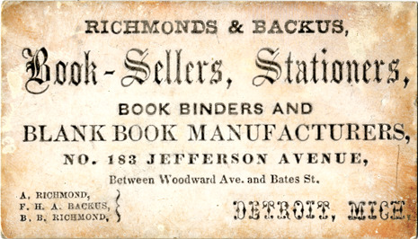 View of a business card for Richmonds & Backus. Printed on front: "Richmonds & Backus, book-sellers, stationers, book binders and blank book manufacturers. No. 183 Jefferson Avenue, between Woodward Ave. and Bates St. A. Richmond, F.H.A. Backus, B.B. Richmond. Between Woodward Ave. and Bates St., Detroit, Mich.