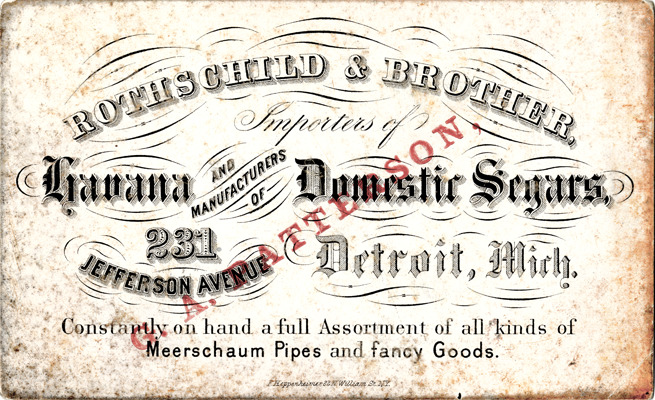 View of a business card for Rothschild & Brother. Printed on front: "Rothschild & Brother, importers of Havana and manufacturers of domestic segars. 231 Jefferson Avenue, Detroit, Mich. Constantly on hand a full assortment of all kinds of Meerschaum pipes and fancy goods. F. Heppenheimer, 22 N. William St., N.Y." Stamped on front: "G.A. Patterson."