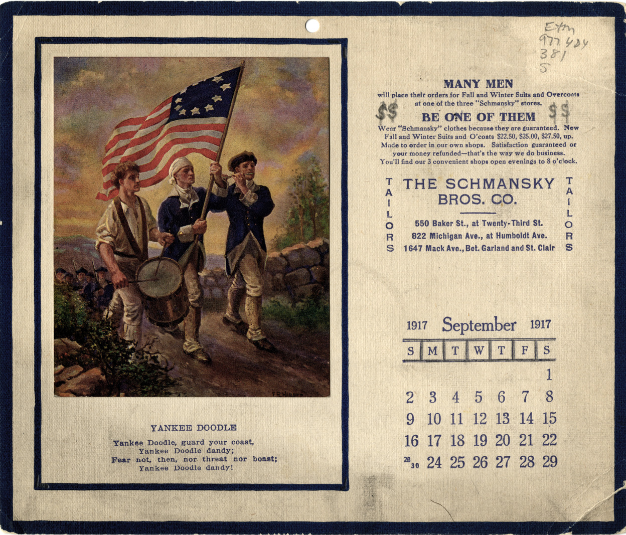 View of a Schmansky Bros. Co. calendar for September 1917, depicting a version of the painting "Spirit of 76." Printed on front: "The Schmansky Bros. Co. tailors. 550 Baker St. at Twenty-Third St., 822 Michigan Ave., at Humboldt Ave., 1647 Mack Ave., bet. Garland and St. Clair. Many men will place their orders for fall and winter suits and overcoats at one of the three 'Schmansky' stores. Be one of them. Wear 'Schmansky clothes because they are guaranteed. New fall and winter suits and o'coats $22.50, $25.00, $27.50, up. Made to order in our own shops. Satisfaction guaranteed or your money refunded -- that's the way we do business. You'll find our 3 convenient shops open evenings to 8 o'clock. Yankee Doodle. Yankee Doodle, guard your coast, Yankee Doodle dandy; fear not, then, nor threat nor boast; Yankee Doodle dandy!"