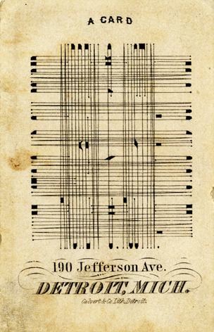 View of a business card for S. Simon & Co. Printed on front: "A card. 190 Jefferson Ave., Detroit, Mich. Calvert & Co. Lith., Detroit." Handwritten on back: "Simon, S. & Co. clothing. 190 Jefferson."