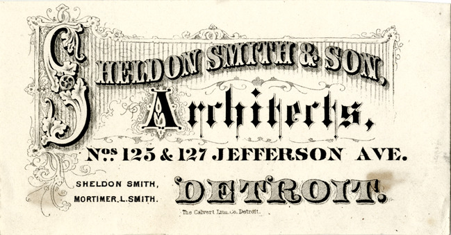 View of a business card for Sheldon Smith & Son. Printed on front: "Sheldon Smith & Son, architects. Nos. 125 & 127 Jefferson Ave., Detroit. Sheldon Smith, Mortimer L. Smith. The Calvert Lith. Co., Detroit."