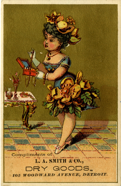 Favorite this☆ Advertising card for L.A. Smith & Co. Description: View of an advertising card for L.A. Smith & Co., depicting a woman holding a jewelry box. Printed on front: "Compliments of L.A. Smith & Co., dry goods. 105 Woodward Avenue, Detroit." Details Resource ID: bh018113 Subject: Dry-goods--Michigan--Detroit Women in advertising Advertising cards Date Issued: Unknown year Format: 1 advertising card : col. ; 4.25 x 2.75 in. Member of: Burton Historical Collection Filing Location: E&M 977.4D4 381 S Rights: Physical rights are retained by DPL. Copyright is retained in accordance with U.S. copyright laws.