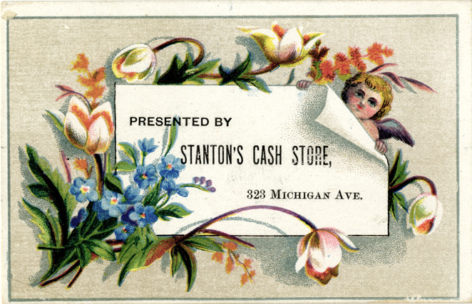 Favorite this☆ Advertising card for Stanton's Cash Store Description: View of an advertising card for Stanton's Cash Store, depicting flowers and a cherub. Printed on front: "Presented by Stanton's Cash Store, 323 Michigan Ave." Details Resource ID: bh018145 Subject: Stores, Retail--Michigan--Detroit Flowers in art Cherubs (Art) Advertising cards Date Issued: Unknown year Format: 1 advertising card : col. ; 3 x 4.5 in. Member of: Burton Historical Collection Filing Location: E&M 977.4D4 381 S Rights: Physical rights are retained by DPL. Copyright is retained in accordance with U.S. copyright laws.