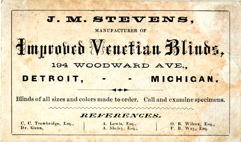 View of a business card for J.M. Stevens. Printed on front: "J.M. Stevens, manufacturer of improved Venetian blinds, 194 Woodward Ave., Detroit, Michigan. Blinds of all sizes and colors made to order. Call and examine specimens. References. C.C. Trowbridge, Esq., Dr. Gunn, A. Lewis, Esq., A. Sheley, Esq., O.B. Wilcox, Esq., F.B. Way, Esq."