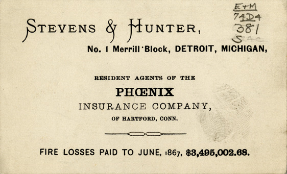 View of a business card for Stevens & Hunter. Printed on front: "Stevens & Hunter, No. 1 Merrill Block, Detroit, Michigan. Resident agents of the Phoenix Insurance Company of Hartford Conn. Fire losses paid to June 1867, $3,495,002.68."