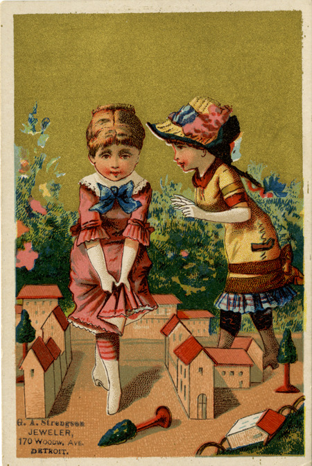 View of a advertising card for G.A. Strengson, depicting two girls playing with a toy village. Printed on front: "G.A. Strengson, jeweler. 170 Woodw. Ave., Detroit."