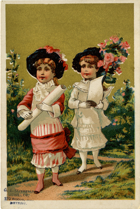 Favorite this☆ Advertising card for G.A. Strengson Description: View of a advertising card for G.A. Strengson, depicting two girls. Printed on front: "G.A. Strengson, jeweler. 170 Woodw. Ave., Detroit." Details Resource ID: bh018166 Subject: Jewelers--Michigan--Detroit Girls in art Advertising cards Date Issued: Unknown year Format: 1 advertising card : col. ; 4.5 x 3 in. Member of: Burton Historical Collection Filing Location: E&M 977.4D4 381 S Rights: Physical rights are retained by DPL. Copyright is retained in accordance with U.S. copyright laws.