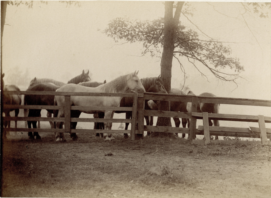 View of Percheron horses behind a wooden fence at Palmer Park. Handwritten on front: "Percherons." Handwritten on back: "Group Percheron mares bred on Palmer farm." Note accompanying portfolio: "To Mrs. T.W. Palmer with best wishes of the Palmer farm boys. Nov. 1887." Printed on portfolio: "Palmer Farm gems."