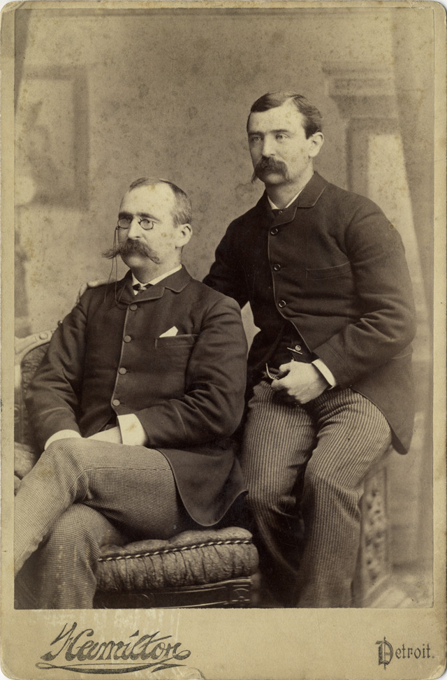 Portrait of William and Orville Allen. Printed on front: "Hamilton, Detroit." Printed on back: "Hamilton. 204 & 206 Woodward Ave., Detroit, Mich." Handwritten on back: "Allen, William. Allen, Orville. Messrs. Wm & Or. Allen. Mr. Orville, seated. Mr. William Allen standing."