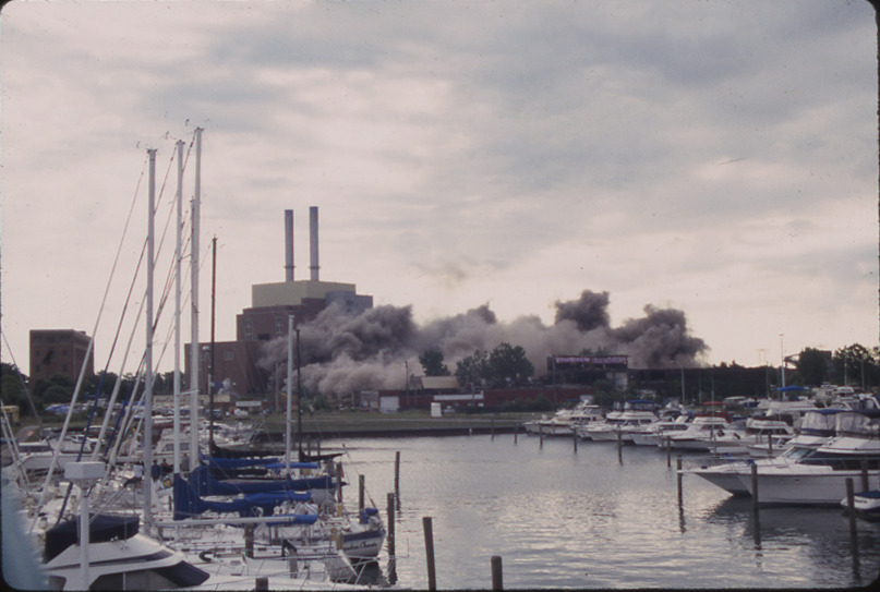 View of the Seven Sisters smokestacks at the Detroit Edison Conners Creek Power Plant on the day of the implosion. Handwritten on mount: "Seven Sisters."