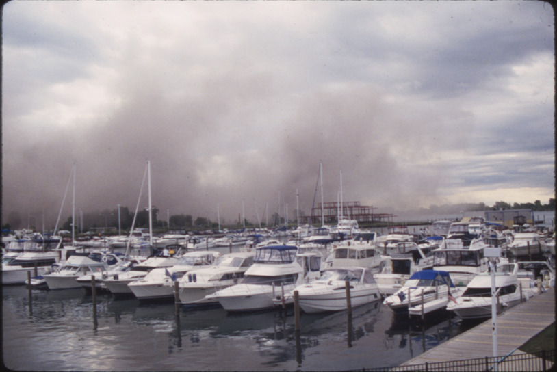 View of the implosion of the Seven Sisters smokestacks at the Detroit Edison Conners Creek Power Plant. Boats in foreground. Handwritten on mount: "Seven Sisters."