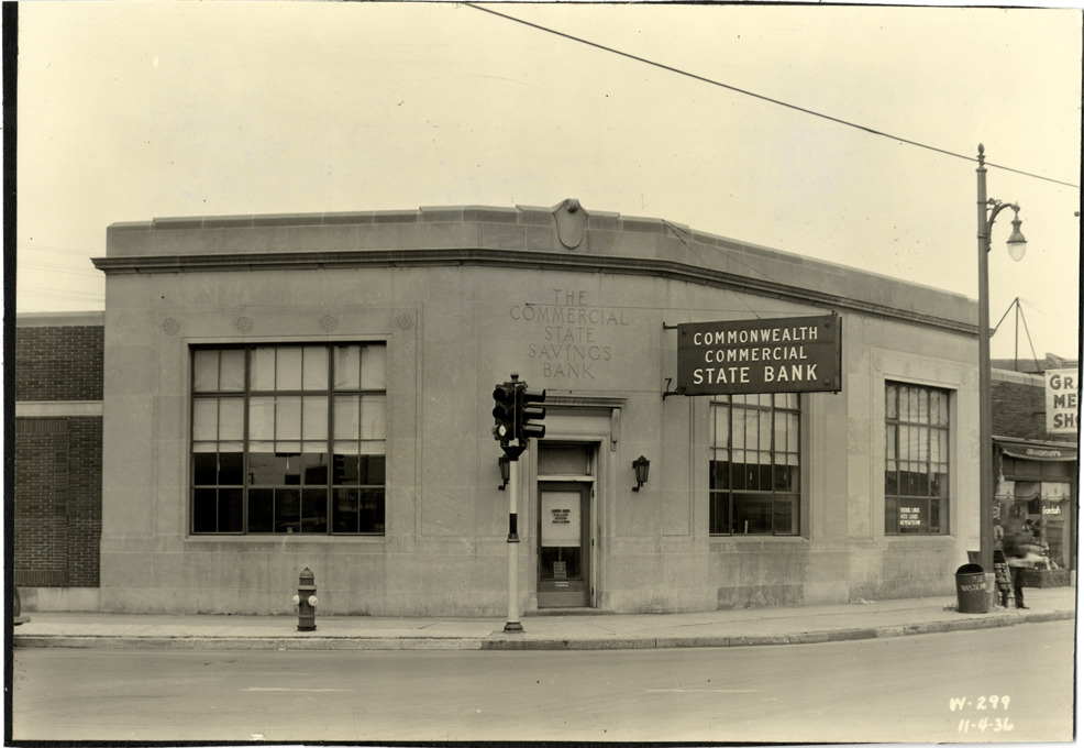 View of the Commonwealth Commercial State Bank on corner. "The Commercial State Savings Bank" is inscribed on building. Traffic light in foreground. Printed on front: "11-4-36."