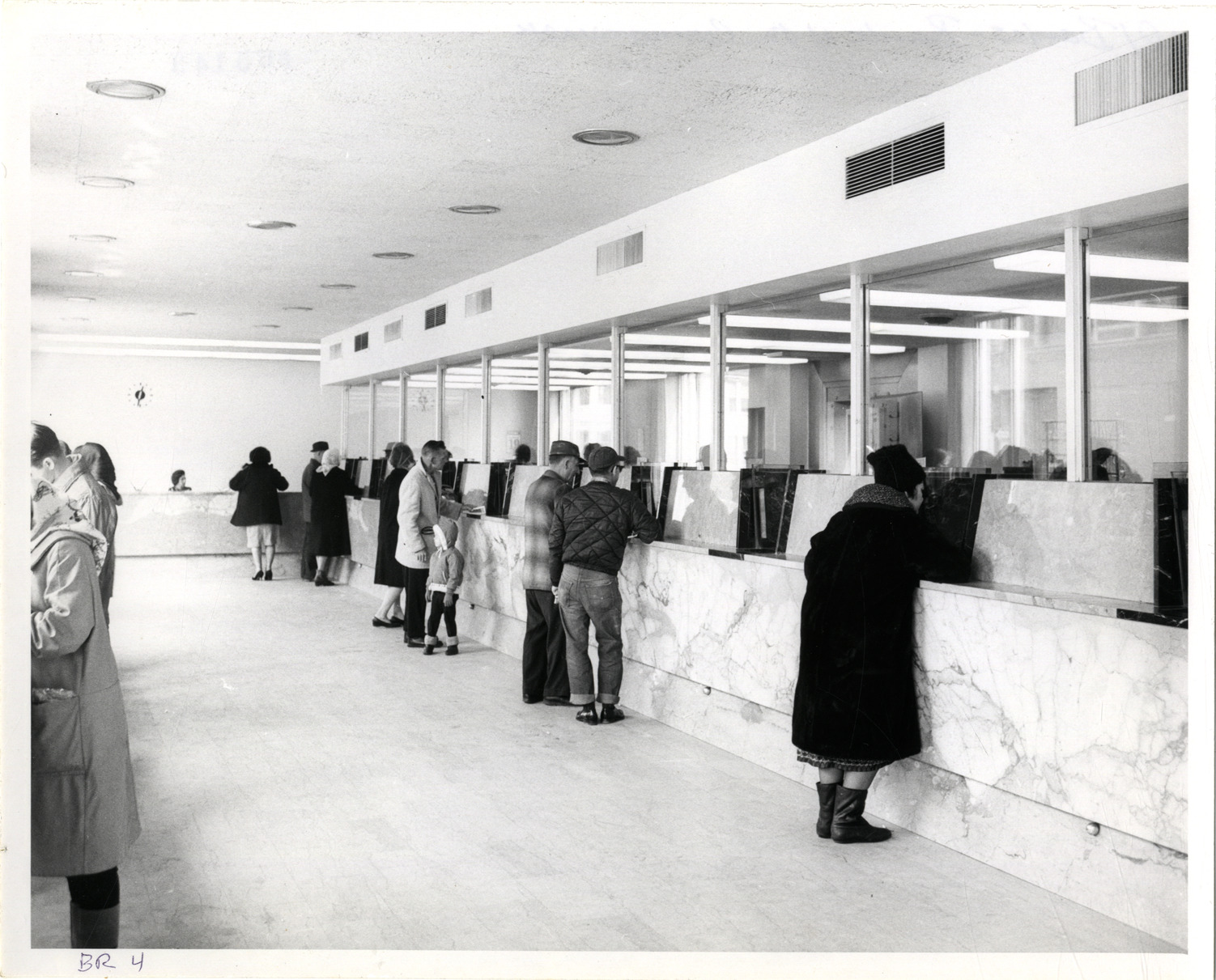 View of customers at teller windows inside the Bank of the Commonwealth, located on the corner of Michigan Avenue and Tarnow. Handwritten on front: "BR 4." Handwritten on back: "Michigan-Tarnow."