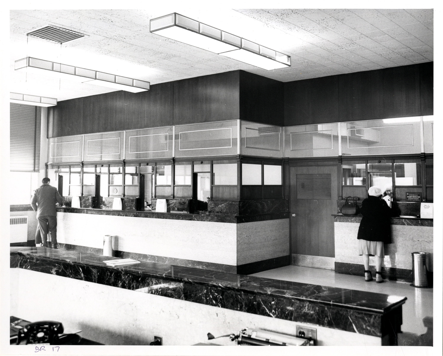 View of customers at teller windows inside the Bank of the Commonwealth, located on the corner of Fort Street and Waterman. Handwritten on front: "BR 17." Handwritten on back: "Fort-Waterman."