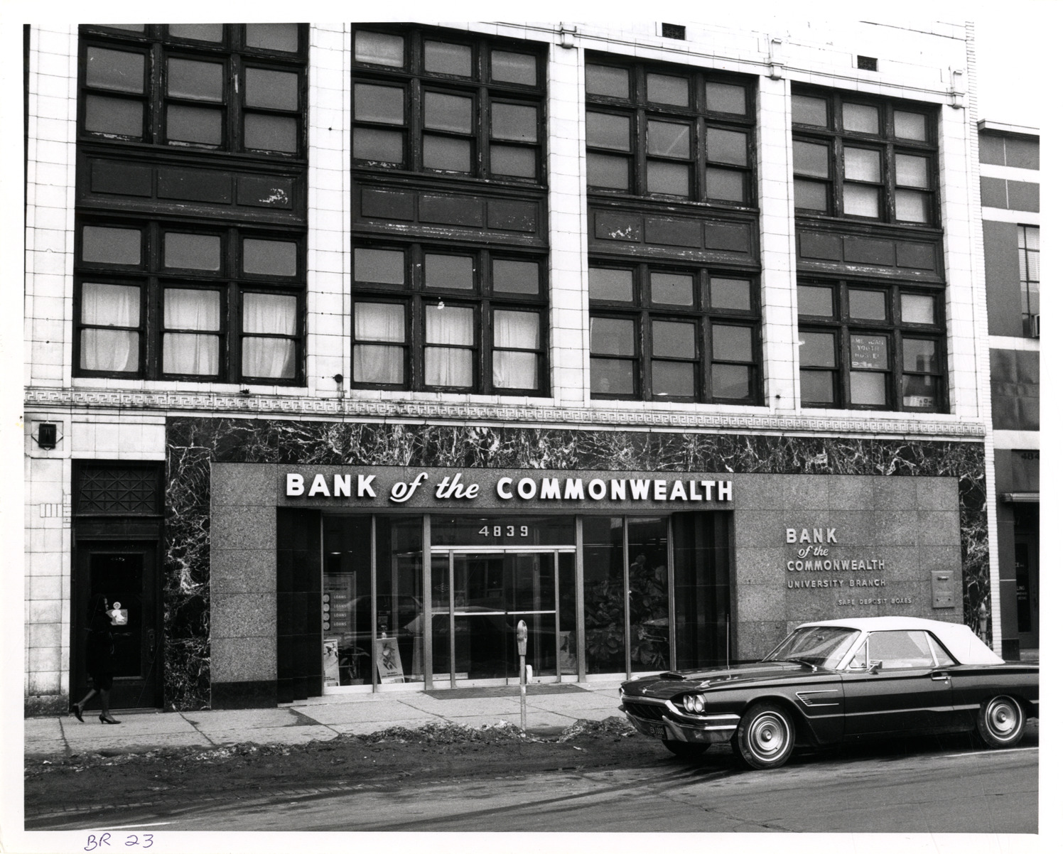 Favorite this☆ Bank of the Commonwealth, University Branch Description: View of the Bank of the Commonwealth, University Branch, located at Woodward Avenue and Warren Avenue. Car parked in street. Handwritten on front: "BR 23." Handwritten on back: "Woodward-Warren." Details Resource ID: bh018272 Subject: Bank buildings--Michigan--Detroit Automobiles--Michigan--Detroit Photographic prints Date Issued: Unknown year Format: 1 photographic print ; 8 x 10 in. Member of: Burton Historical Collection Filing Location: D/Banks-Bank of the Commonwealth Rights: Physical rights are retained by DPL. Copyright is retained in accordance with U.S. copyright laws.