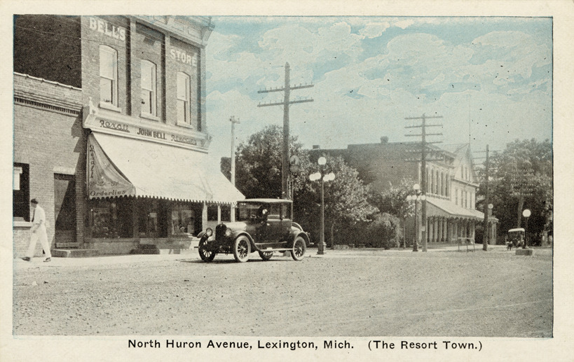 Favorite this☆ North Huron Avenue, Lexington, Michigan Description: View of commercial buildings and car on North Huron Ave. in Lexington, Michigan. Printed on front: "North Huron Avenue, Lexington, Mich. (The resort town)." Printed on back: "Pub. by F.E. Bell, Lexington, Mich." Details Resource ID: bh018285 Subject: Streets--Michigan--Lexington Commercial buildings--Michigan--Lexington Automobiles--Michigan--Lexington Postcards Publisher: F.E. Bell Date Issued: Unknown year Format: 1 postcard : col. ; 3.5 x 5.5 in. Member of: Burton Historical Collection Filing Location: M/Localities-Lexington Rights: Physical rights are retained by DPL. Copyright is retained in accordance with U.S. copyright laws.