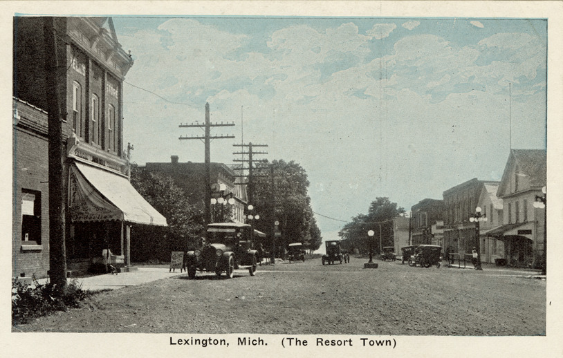 View of Bell's Drug Store on Huron Ave. in Lexington, Michigan. Cars in street. Printed on front: "Lexington, Mich. (The resort town)." Printed on back: "Published by F.E. Bell, Lexington, Mich."