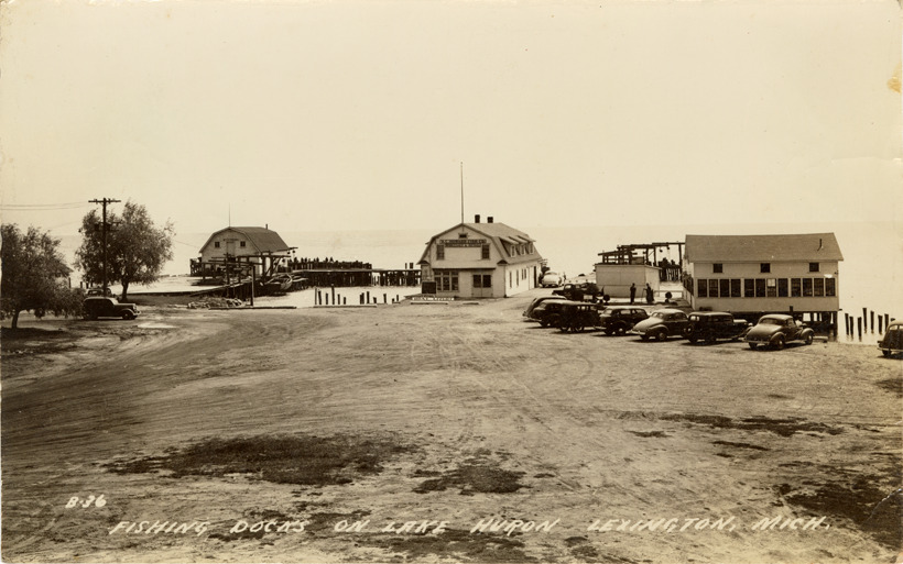 View of fishing docks and wooden-frame buildings on Lake Huron at Lexington, Michigan. Cars are parked on right. Printed on front: "Fishing docks on Lake Huron, Lexington, Mich." Printed on back: "All rights reserved. The L.L. Cook Co., Milwaukee."