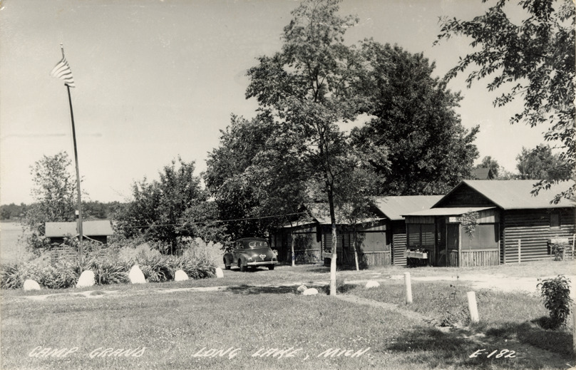 View of log cabins at Camp Grand resort, Long Lake, Michigan. Car and flagpole in background. Printed on front: "Camp Grand, Long Lake, Mich." Printed on back: "All rights reserved. The L.L. Cook Co., Milwaukee." Handwritten on back: "Having some fun, rain plenty." Card is postmarked August 1, 1950.
