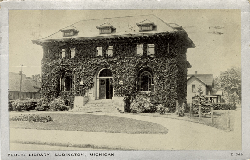 View of the ivy-covered Public Library in Ludington, Michigan. Printed on front: "Public Library, Ludington, Mich." Printed on back: "Mfd. by Wayne Paper Box Prtg. Corp., Fort Wayne, Ind." Handwritten on back: "Dear Doctor Quaife, Plan to leave here Monday so will miss the State Hist. Soc. meeting. Am enjoying the vacation and rest. Say 'hello' to Bill and any of the others you may see with best wishes."