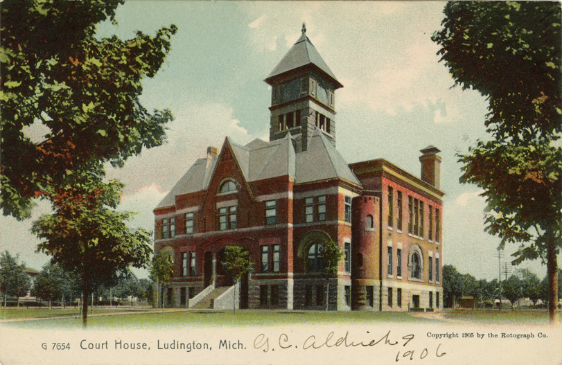 View of the courthouse in Ludington, Michigan. Printed on front: "G 7654. Court house, Ludington, Mich. Copyright 1905 by the Rotograph Co." Handwritten on front: "G.C. Aldrich, 1906." Printed on back: "The Rotograph Co., N.Y., City, (Germany)."