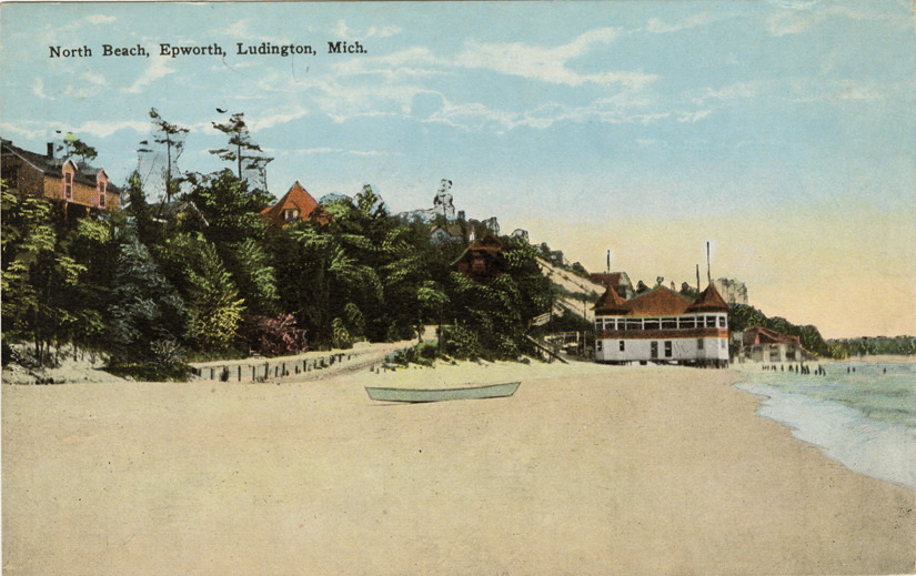 View of North Beach, Epworth Heights resort in Ludington, Michigan. Rowboat on shore. Printed on front: "North Beach, Epworth Heights, Ludington, Mich." Printed on back: "E.C. Kropp Co., Milwaukee."