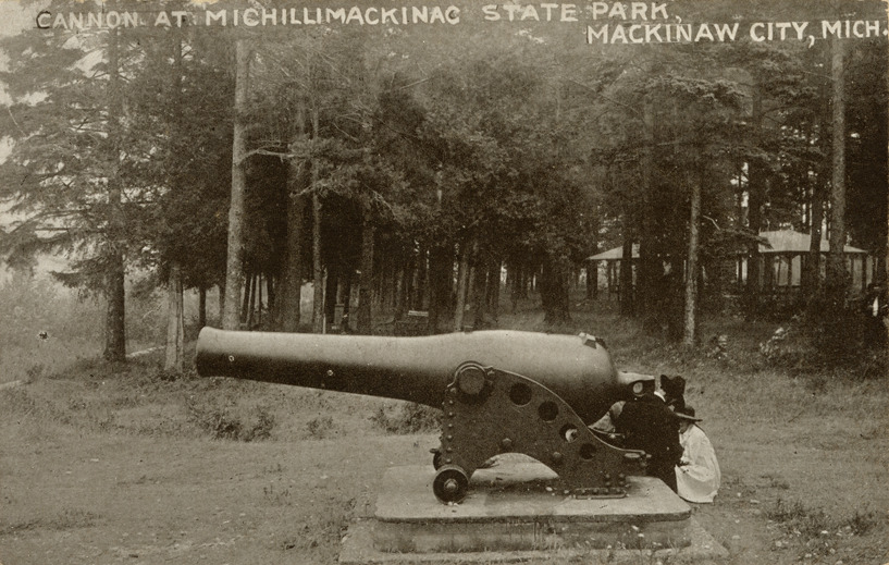 View of a cannon at Michilimackinac State Park, Mackinaw City, Michigan. Printed on front: "Cannon at Michillimackinac [sic] State Park, Mackinaw City, Mich." Printed on back: "V.O. Hammon Publishing Co., Chicago."