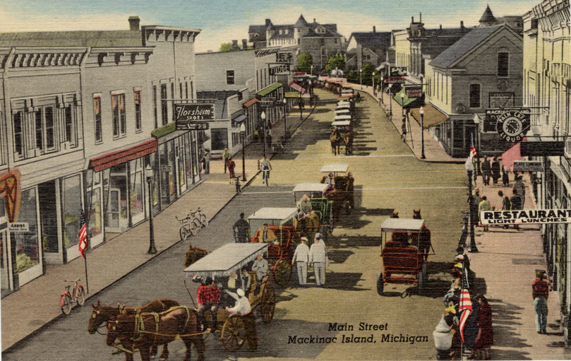 View of commercial buildings and horse-drawn carriages on Main Street at Mackinac Island, Michigan. Printed on front: "Main Street, Mackinac Island, Michigan." Printed on back: "Visitors enjoy carriage rides around the island seeing Mackinac's historic and scenic points of interest. Accommodations are available on the Island to fit any pocket book. Benjamin's Photo Art Service, Mackinac Island, Mich. Genuine Curteich-Chicago 'C.T. Art-Colortone' post card (reg. U.S. Pat. Off.)"
