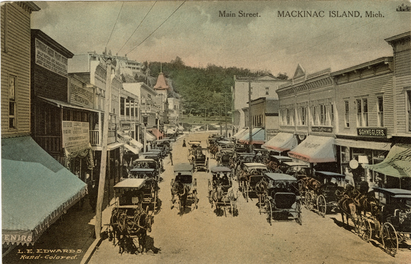 View of commercial buildings and horse-drawn carriages on Main Street at Mackinac Island, Michigan. Printed on front: "Main Street, Mackinac Island, Mich. L.E. Edwards. Hand-colored." Handwritten on back: "Mackinac Isle. July 24th. Dear Mrs. Warren, You see where I am had to run away from the heat. It has been too cool since here since we came. This picture does not not look much like Mackinac when we first saw it. Does it? Lovingly yours, Helen [undecipherable]." Card is postmarked July 24, 1911.