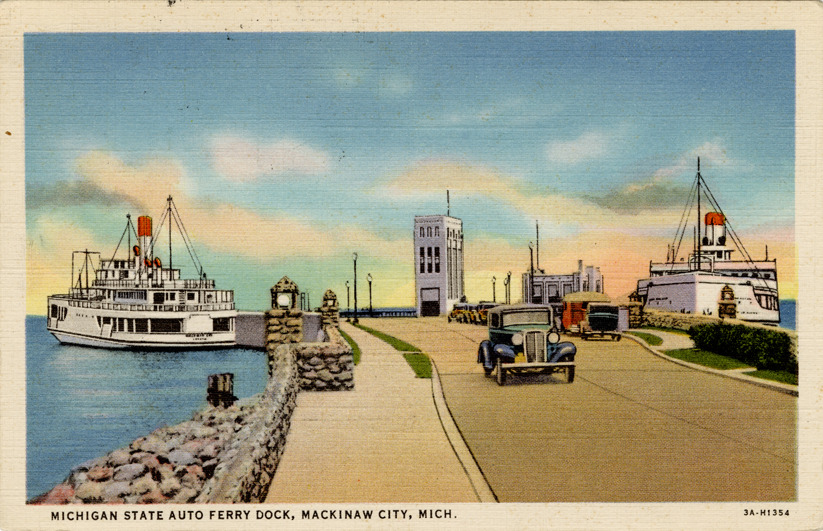 View of Michigan State Auto Ferry Dock at Mackinaw City, Michigan. Car in foreground; ferries in background. Printed on front: "Michigan State Auto Ferry Dock, Mackinaw City, Mich." Printed on back: "G.H. Wickman, Mackinac Island, Mich. Made in U.S.A. C.T. Art Colortone. Reg. U.S. Pat. Off. Made only by Curt Teich & Co., Inc., Chicago, U.S.A." Handwritten on back: "Dear Bud, Herb, We are here in Mackinac [sic] City. Making pictures at Camp Wilderness, about eleven miles from here. Go to the Soo tomorrow, then north. Hope you all are well, Mac." Card is postmarked August 7, 1934.