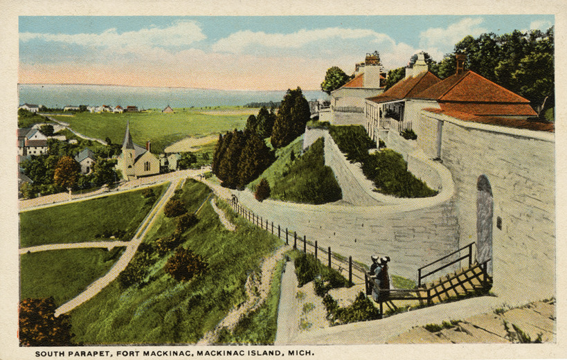 View of the south parapet of Fort Mackinac on Mackinac Island, Michigan. Printed on front: "South parapet, Fort Mackinac, Mackinac Island, Mich." Printed on back: "The old fort, Mackinac Island, Mich. The parapets and old-time blockhouses have an air delightfully antiquated and picturesque. Thousands of visitors ascend the steep slope annually to make exploration of its quaint construction. With open gate and unbarred port, Fort Mackinac welcomes all comers to ramble through its bounds and ascend the parapets whence the panoramic view enfolded is an inspiration. Published by G.H.W."