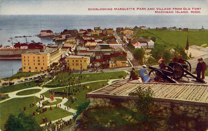 View of Marquette Park, Mackinac Island, Michigan from Fort Mackinac. Printed on front: "Overlooking Marquette Park and village from old fort, Mackinac Island, Mich." Printed on back: "1581. V.O. Hammon Pub. Co., Chicago."