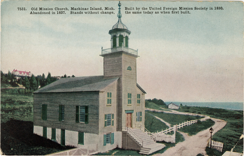View of the Mission Church on Mackinac Island, Michigan. Printed on front: "7531. Old Mission Church, Mackinac Island, Mich. Bult by the United Foreign Mission Society in 1830. Abandoned in 1837. Stands without change, the same today as when first built."