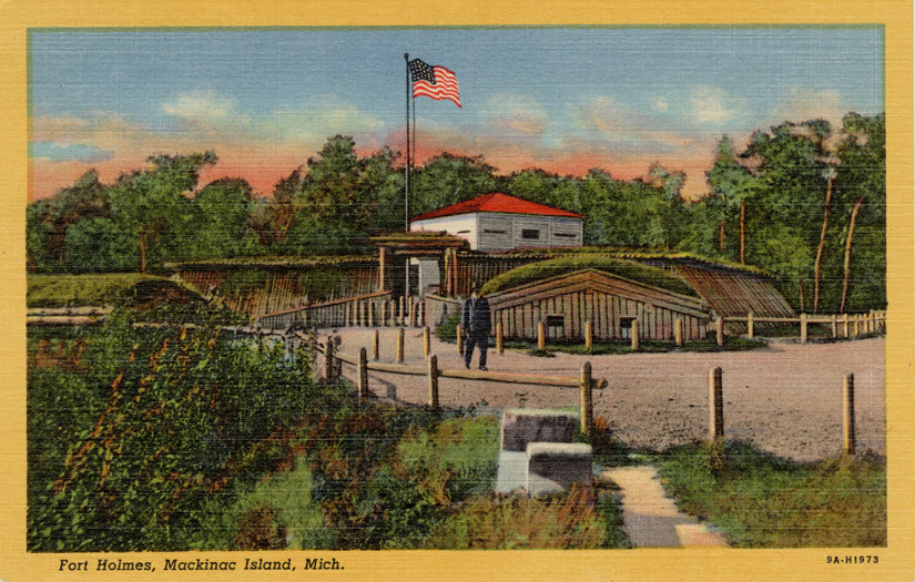 View of Fort Holmes on Mackinac Island, Michigan. Printed on front: "Fort Holmes, Mackinac Island, Mich." Printed on back: "Fort Holmes. Highest point on the island 325 feet above the Straits and 168 feet above Fort Mackinac. Built by the British soon after the capture of Fort Mackinac, July 17, 1812. British named it Fort George, after the reigning English King George III, renamed by the Americans Fort Holmes, after Major Andrew Hunter Holmes, who was killed in the battle of Mackinac Island, August 4, 1814, in an attempt to take the fort from the British. The block house, central feature of the fort was destroyed by the Americans after the war, but was later restored and was destroyed by fire in 1933. Restored to its original form by the Mackinac Island State Park Commission, 1936. Benjamin's Photo Art Service, Mackinac Island, Mich. Genuine Curteich-Chicago 'C.T. Art-Colortone' post card (reg. U.S. Pat. Off.)"