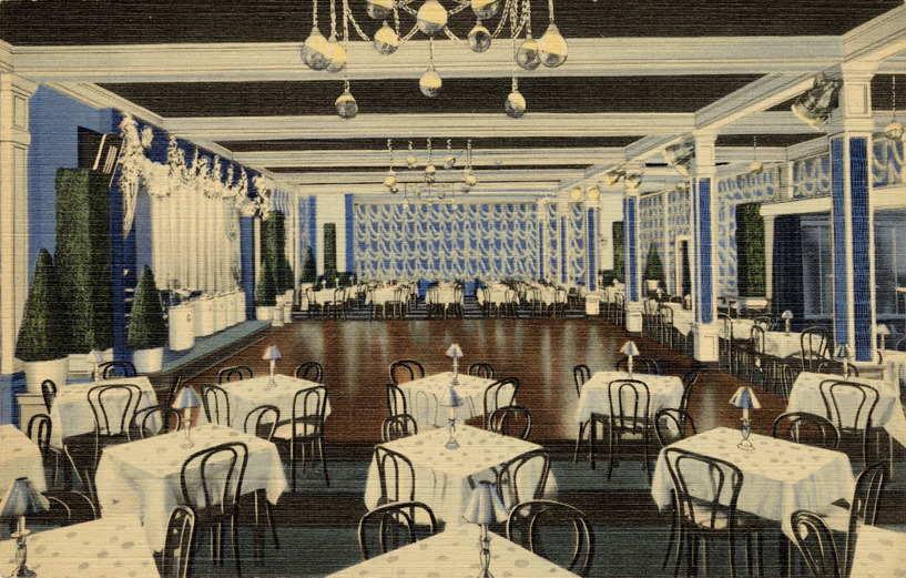 View of Blue Room at Grand Hotel on Mackinac Island, Michigan. Room is furnished with tables, chairs and a dance floor. Printed on front: "Grand Hotel, Mackinac Island, Michigan. World's largest summer hotel. Blue Room. Genuine Curteich-Chicago 'C.T. Art-Colortone' post card (reg. U.S. Pat. Off.)"